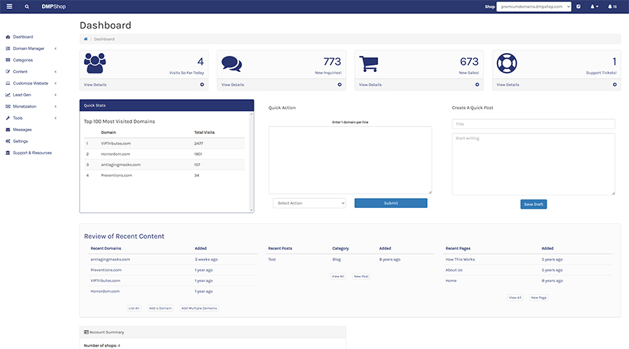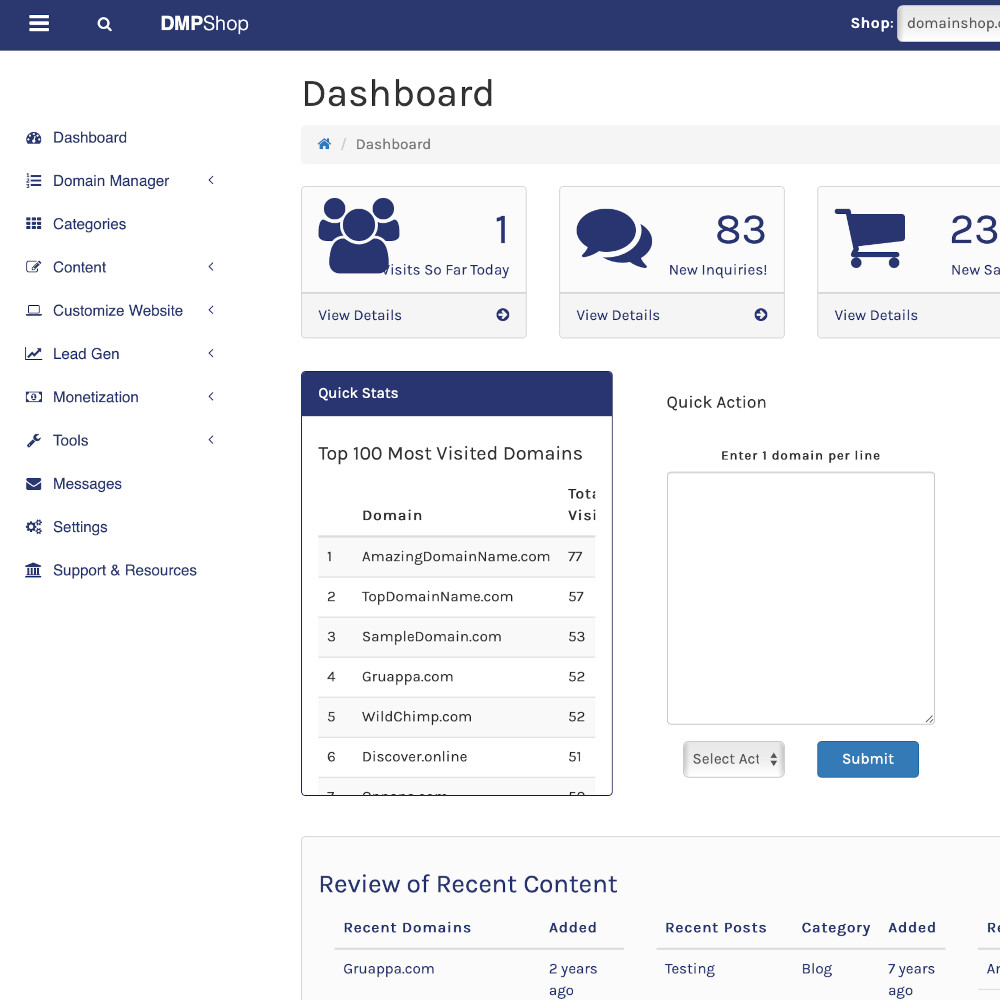 The project entailed developing a feature-rich backend database-driven control panel interface. Features included importing domain names in bulk, customizing branded domain sales shops, accepting payments, lead generation, content tools, SEO tools, social media integrations and much more.