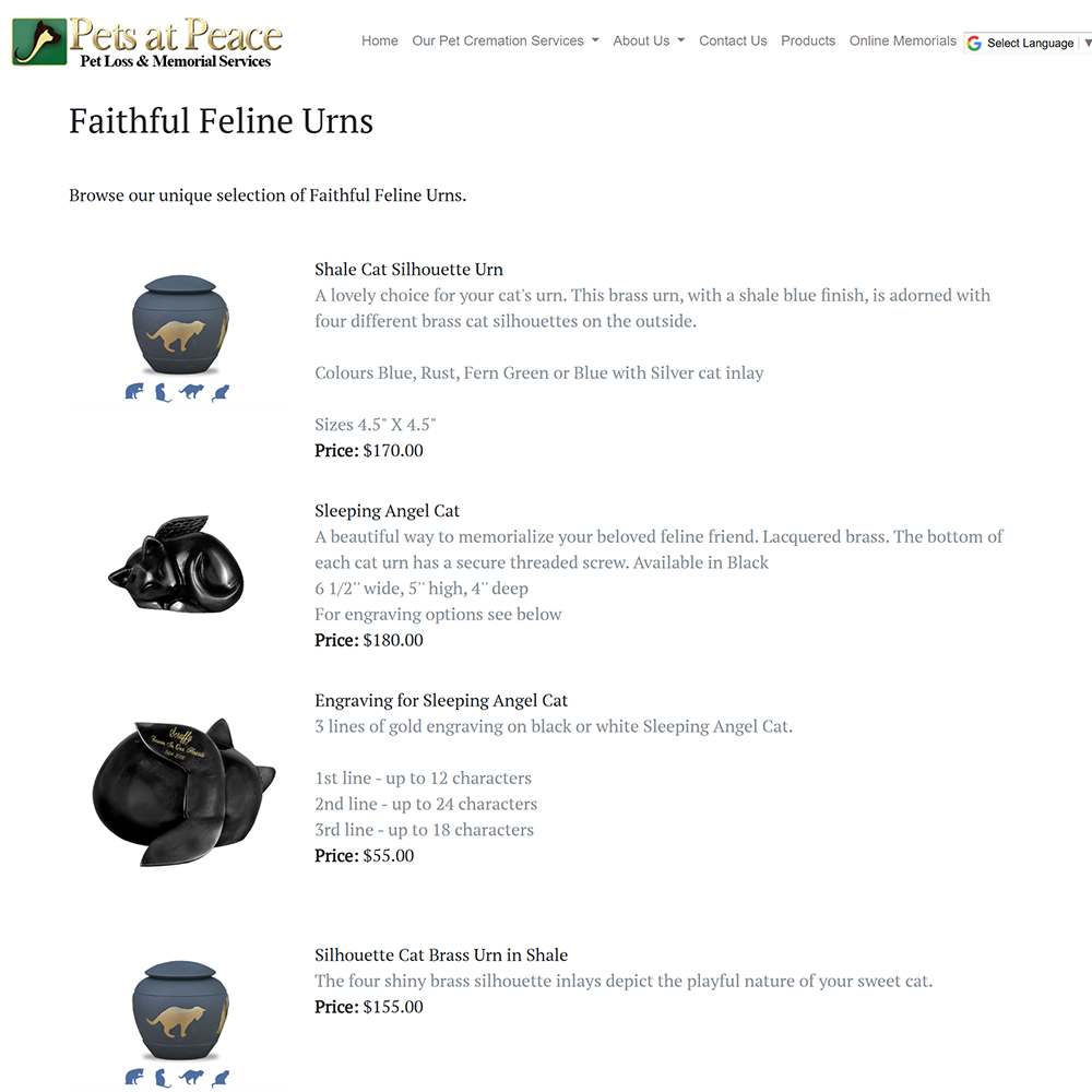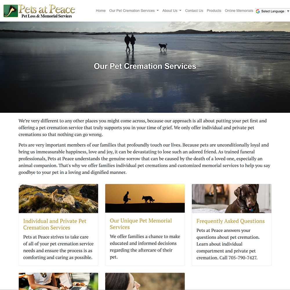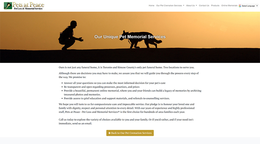 The challenge was to create a clean, easy-to-use, informative website where content is easy managed. In particular, it was very important for the client to have a dynamic catalogue management system that can be controlled in-house, as well as an online memorials feature where clients could easily post photos of their pets along with stories. This memorial system needed to robust security, and yet be very simple for clients to access and post their memorial tributes.